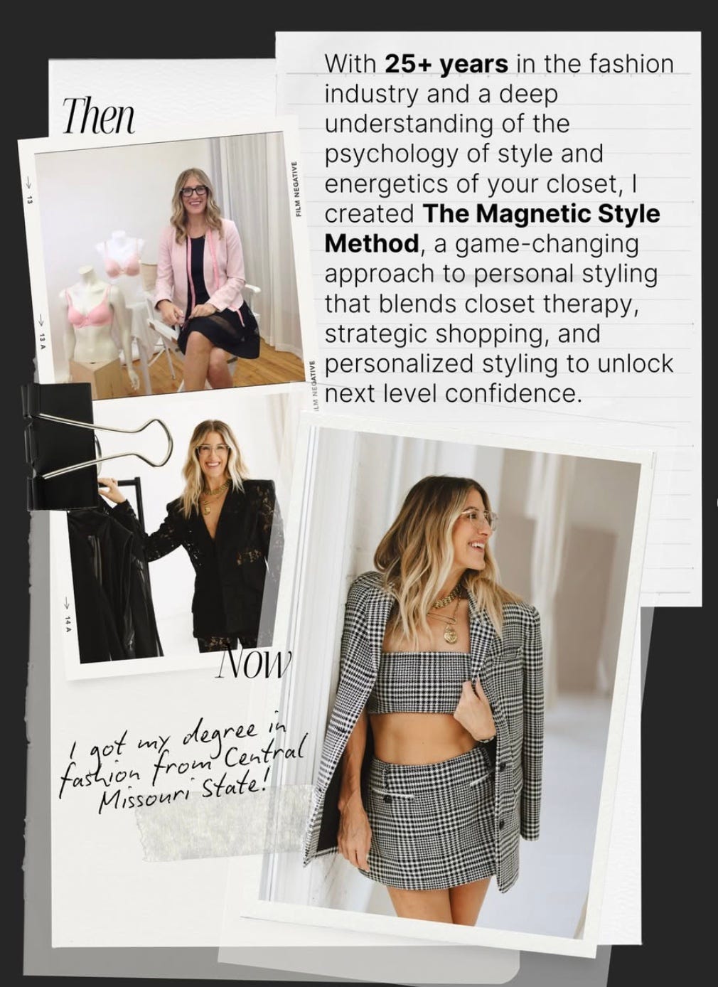 This is where the as if becomes real. Chellie didn’t wait for Jen to feel like a powerful woman before dressing her like one. She dressed her like one first, and Jen’s brain followed.
