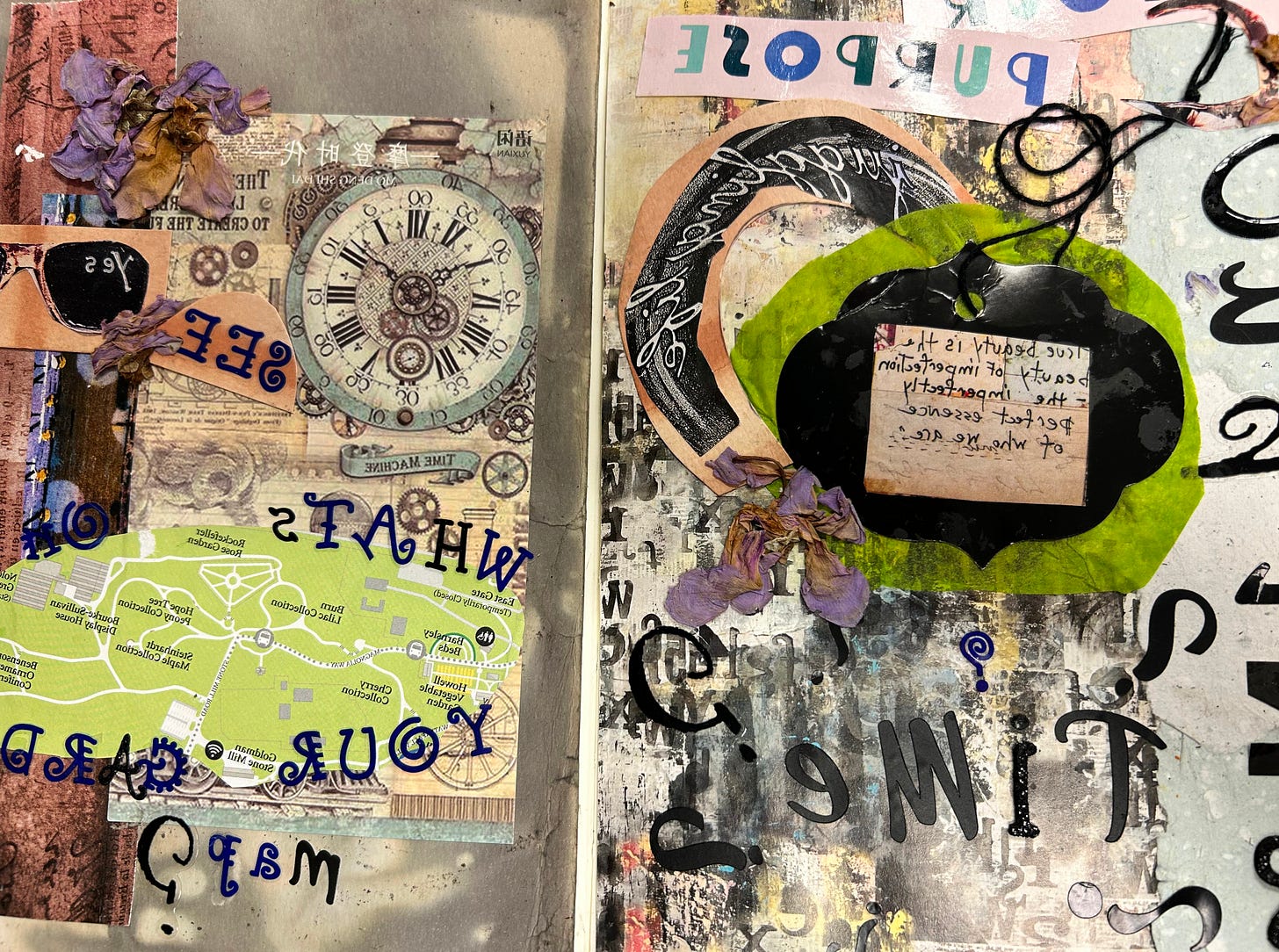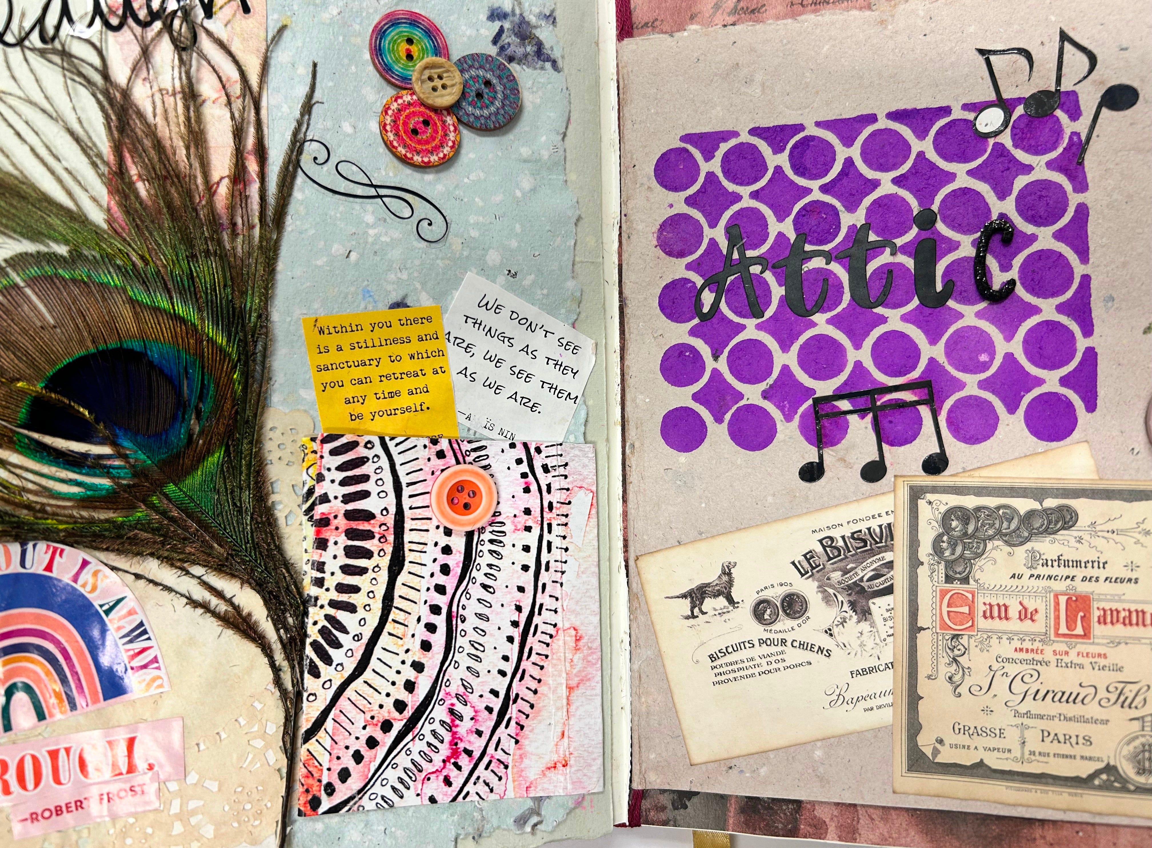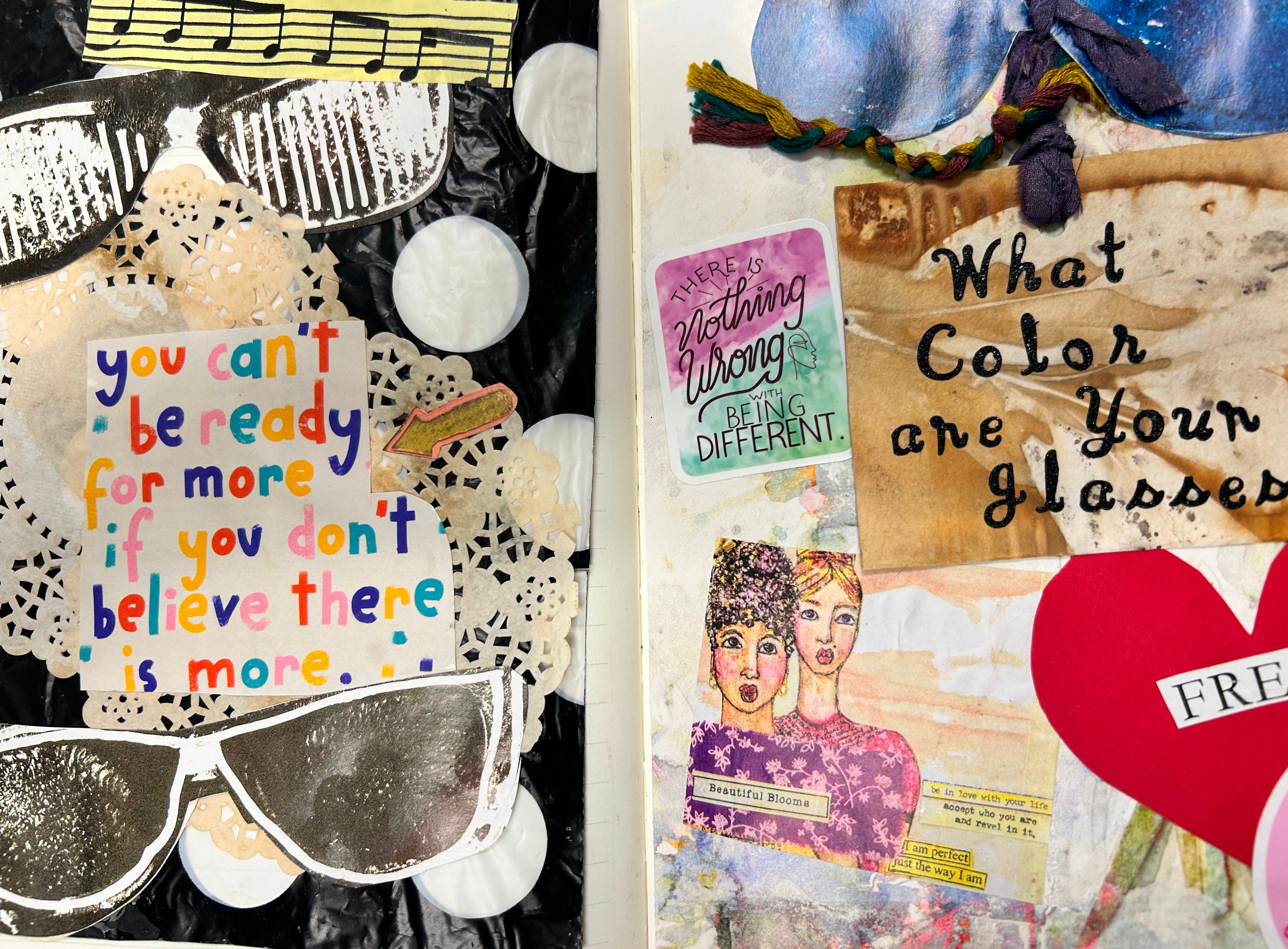 She pulled out her journal and opened it to a two-page spread. A centerfold of writing and crafting, of mixed media and art, the borders decoupaged and filled with prose. It was beautiful.